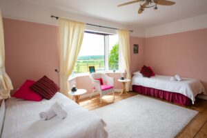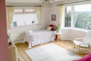 This nurturing and warming room is across the hall from than the meditation room and has the same beautiful view across the levels, a great view of the world famous Glastonbury Tor and an additional homely extra, your very own fireplace!